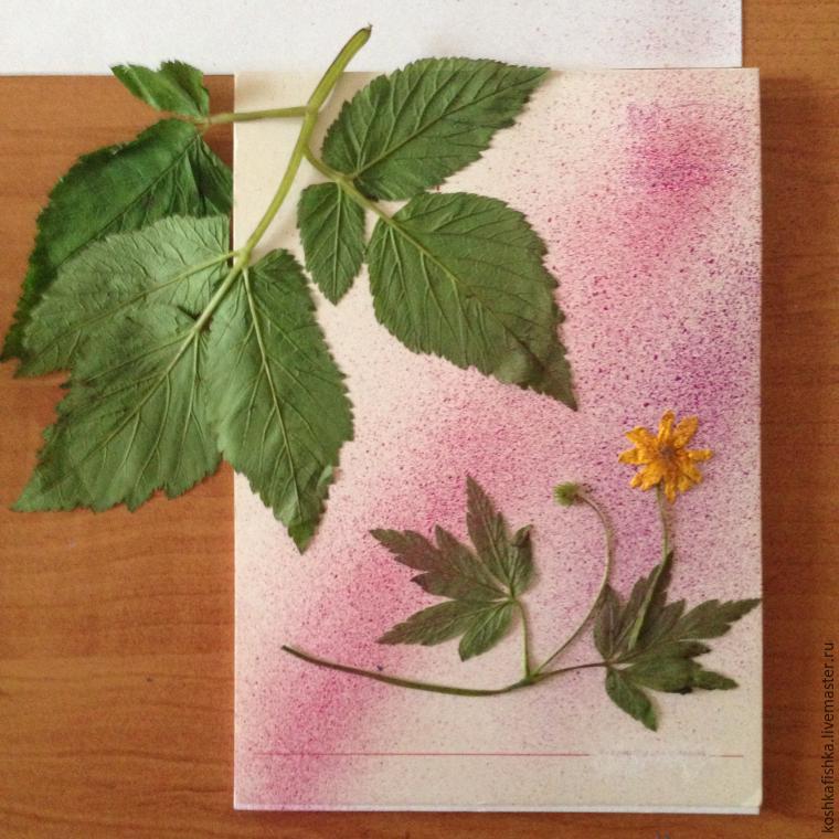 Накладываем наш гербарий таким образом, чтобы места, которые мы закрашивали белым, остались открытыми (их мы повторно закрасим, иначе они не эстетично останутся на виду). Постарайтесь создать из листьев композицию на обложке. Убедитесь, что все листочки и стебельки примыкают к поверхности блокнота. Я для уверенности брызгала гербарий временным аэрозольным клеем и прижимала к обложке блокнота. Но клей — это не обязательно.